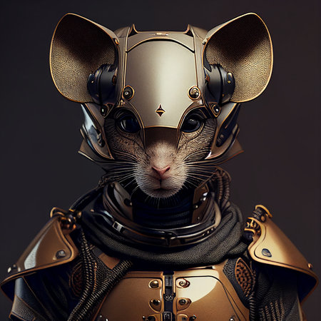 Portrait of a mouse in a helmet and armor. 3d illustration.