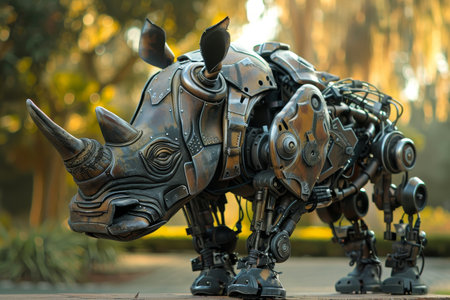 A striking mechanical rhinoceros crafted from metal and gears captures attention in a vibrant garden, illuminated by soft sunlight, showcasing artistic creativity.