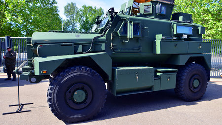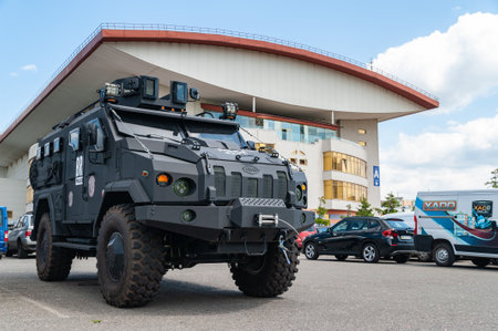 Armored car. Police armored car of the VARTA brand at the international exhibition ARMS AND SECURITY - 2021. Selective focus. Kiev. Ukraine - June 18, 2021.
