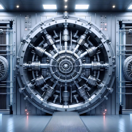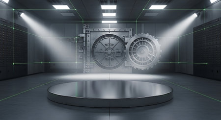 A secure database vault stands closed, featuring a strong lock. The environment suggests high security measures for protecting sensitive information.