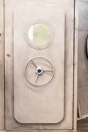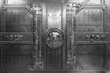 Round, stainless steel vault door with a polished, metallic finish. The door is mounted on a beige wall, which provides.. Suitable for corporate presentations, web banners, marketing layouts and UI design. Features: large, round, stainless, steel, vault.