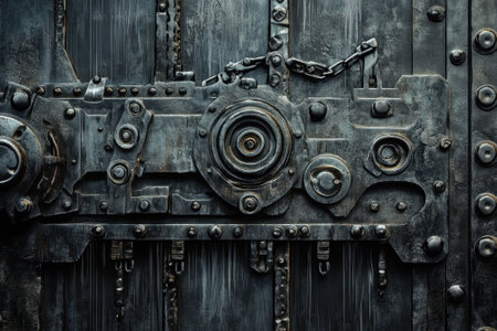 Close-up view of a heavy metallic door featuring intricate mechanisms and textures captured in low light.