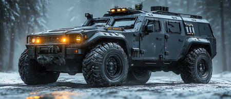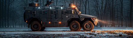 A military armored vehicle drives through a snowy forest at night Its headlights cut through the darkness, illuminating the snow-covered ground AI Generative
