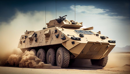 War Concept. Armored vehicle in the desert. 3D Rendering