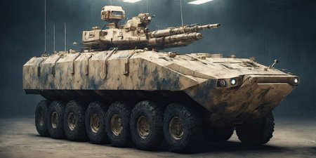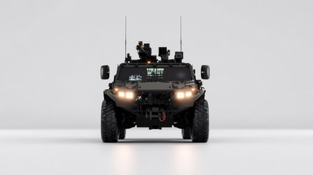 An armored military vehicle is captured from a frontal perspective, set against a clean white backdrop.
