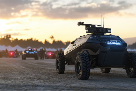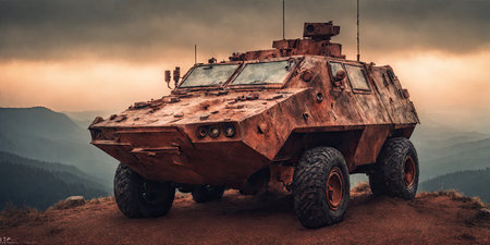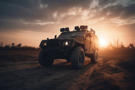armored car parked on the side of the road at sunset, captured in a super close-up shot. this low angle photograph, taken with the high detailed sony alpha a7 mark iv, showcases the realistic details of the vehicle. the image is shot in 8k resolution, providing a stunning visual experience. ai generated