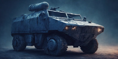 Military vehicle in the dark with smoke and fog. 3d rendering