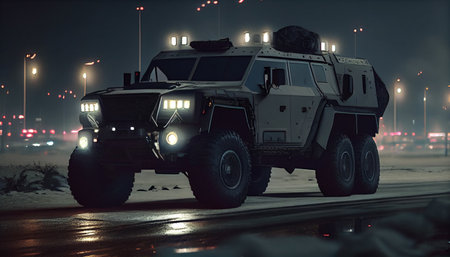 Armored SUV 4x4 on street of city at night. Invasion, occupation. Suppression of protests. Ai generative