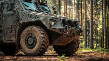 A military vehicle navigates through a dense forest, showing its rugged design and powerful tires. Sunlight filters through the trees, illuminating the terrain around it.