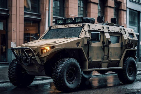 An army vehicle in a street setting on a rainy day. AI-generated.