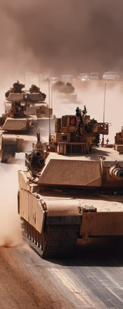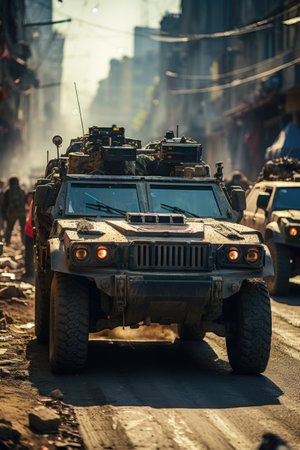 A convoy of armored vehicles cuts through the desolation of a war-torn city, a steadfast reminder of the military's commitment to restore peace and order. Generative AI