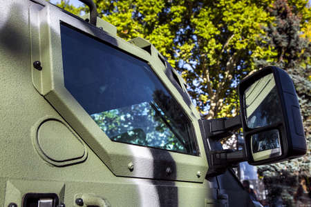 Side window of an armored military truck with a rearview mirror and a hatch for firing from a military vehicle.