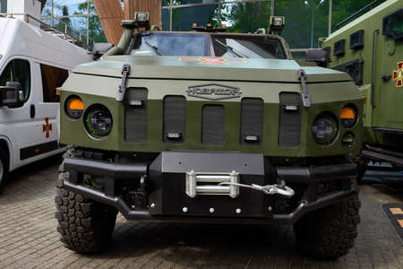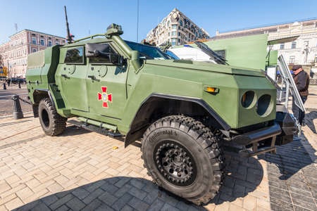 Kyiv, Ukraine - October 15, 2021: The exhibition of modern samples of military equipment The digital future of the army is being held on Mykhailivska Square in Kyiv. The APC Novator is a light armored vehicle.