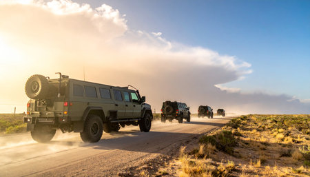 Military trucks traverse rugged landscape at sunset, kicking up dust clouds, highlighting the power and determination of armed forces in action