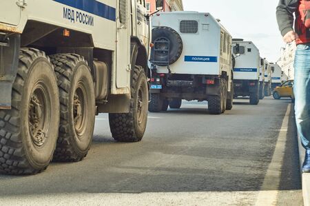 Moscow - march 26,2017. Forbidden political meeting against corruption. Column of police trucks for arresting people driving along Tverskaya street