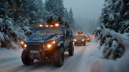 A military convoy moves through deep snow in a dense forest as soldiers ride on armored vehicles. The atmosphere is cold and misty, showcasing the challenges of winter operations. Trees are coated in snow, creating a serene yet powerful backdrop.