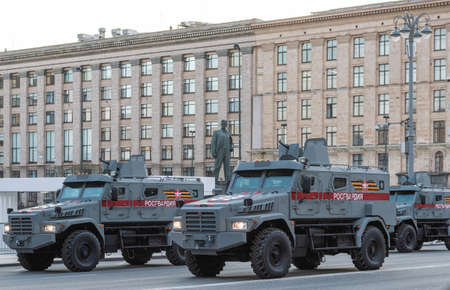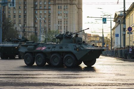 MOSCOW, RUSSIA-APRIL,2019. Parade of military equipment in honor of the Victory Day on the streets of Moscow. Modern combat tracked and wheeled vehicles moving close-up. Celebration parade in Moscow.