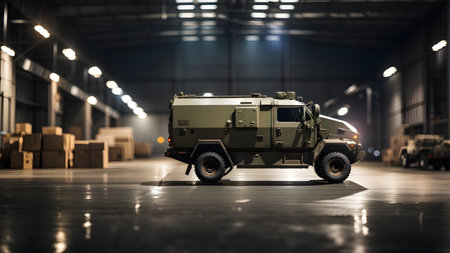 Military vehicle in warehouse at night. Military transportation and logistics concept.