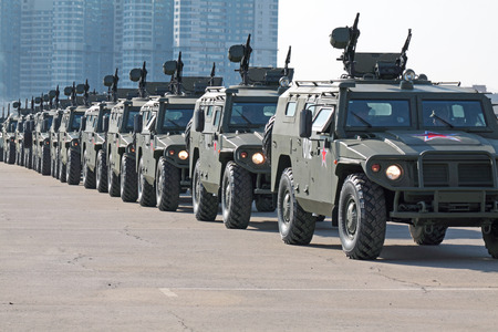 MOSCOW, RUSSIA, KHODYNKA FIELD, - APR 26: military vehicles are going to pass on Red Square. The rehearsal is to celebrate the upcoming 66th Anniversary of Victory Day (WWII) on May 9th.