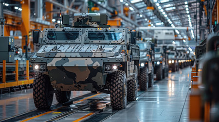 Military technical vehicle under production on industrial factory line, showcasing defense manufacturing and armored transport assembly.