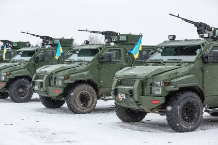 LVIV, UKRAINE - DECEMBER 30, 2014: Armed forces of Ukraine. Military and armored vehicles at the International Center for Peacemaking and safety before transferring it into zone of military conflict
