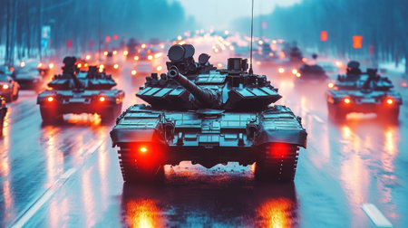 Tanks move cautiously along a busy city street amid rain and low light, creating a dramatic atmosphere.