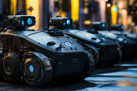 Advanced robots with glowing lights are positioned in a modern city street, showcasing their technology at night.