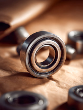 This image features an intricate close-up view of precision metal bearings, showcasing their smooth surfaces and cylindrical design, perfect for industrial applications.