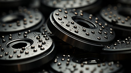 Close-up of metallic washers stacked together, showcasing intricate details and reflections. Industrial and manufacturing concept with a focus on precision.