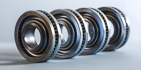 This image features a detailed arrangement of metal bearings stacked artistically against a minimalist gray background, ideal for industrial and mechanical projects.