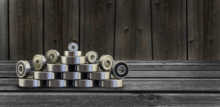 Metal Bearings on a wooden background with reflection. Composition with bearings. Mechanisms, transport.