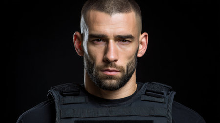 This striking portrait captures a determined male security professional in a tactical vest, exuding confidence and intensity against a dark background.
