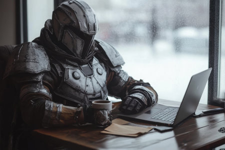 Cyborg knight with a shield; cyberspace. Security, protection safety of the net, data. Network Tech. Generative AI