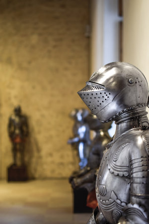 Brussels, Belgium - August 17, 2019: Armour exhibit in the gallery of The Royal Museum of the Armed Forces and Military History, famous military museum in Brussels.