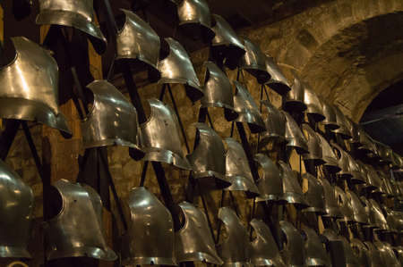 A detail picture from the old armory. The armor is on the wall and looking like pattern. Used by knights and soldiers in old middle ages.