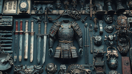 Collection of samurai armor, swords, helmets, and decorative objects displayed on a dark wall, showcasing intricate details and craftsmanship.