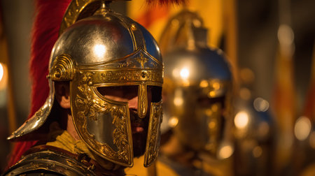 This image showcases highly detailed golden Roman helmets and armor, with a shallow depth of field. The composition highlights the shiny metal surfaces and intricate designs. The lighting appears warm, creating a historical and dramatic ambiance. Suitable for editorial features, historical publications, or visual projects.