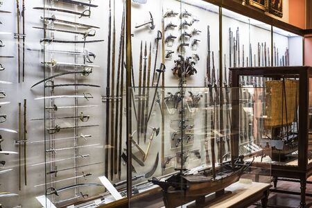 MADRID, SPAIN - MARCH 28, 2018: Expositions Maritime Museum in Madrid history of the Spanish Navy ship models historical artifacts.