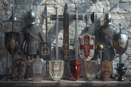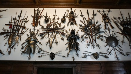A collection of medieval armor and weapons are displayed on a wall. Scene is one of historical significance and the idea is to showcase the craftsmanship and design of these ancient weapons