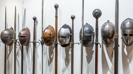 A striking arrangement of historical armor showcasing a variety of helmets and spears mounted on a wall, ideal for illustrating themes of medieval warfare and craftsmanship.