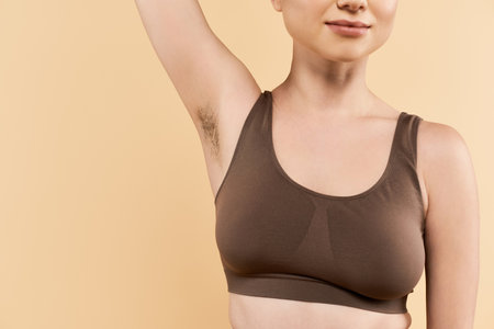 Hairy unshaven female armpits. Body positive trend. Woman wearing bra raised arms. Acceptance of body naturalness