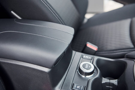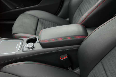 Close up of an elegant car armrest upholstered in black handmade leather. Interior view