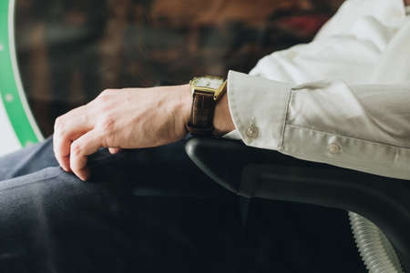 Employer and employee. Harassment behavior. Business woman hand on subordinate man knee.