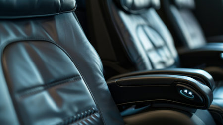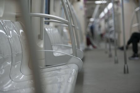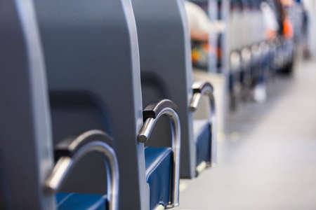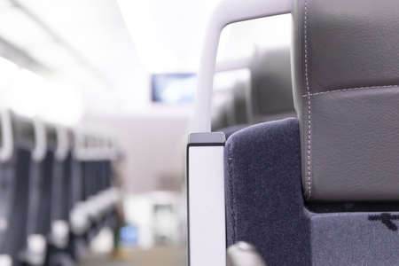 An empty cabin of the aeroexpress train without passengers. Soft seats in a row with leather headrests. Public place. Selective focus. Close-up
