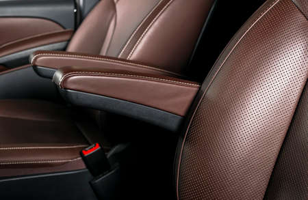 Modern luxury car brown leather interior. Part of leather car seat details with white stitching. Interior of prestige car. Comfortable perforated leather seats. Brown perforated leather. Car detailing