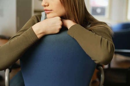 Close-up of a woman sitting on a chair in a waiting room