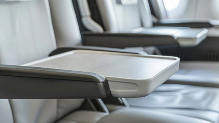 Empty folding tray table on an airplane seat