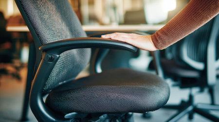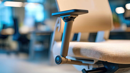 Close-up view of an ergonomic office chair armrest in a modern workspace, highlighting comfort and design. Ideal for office and home environments.
