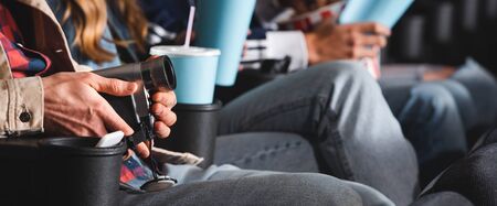 panoramic shot of man shooting with digital camera in cinema