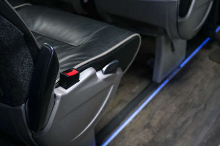Red seatbelt clip at bus seat. Seat belts are compulsory on long distance coaches in UK